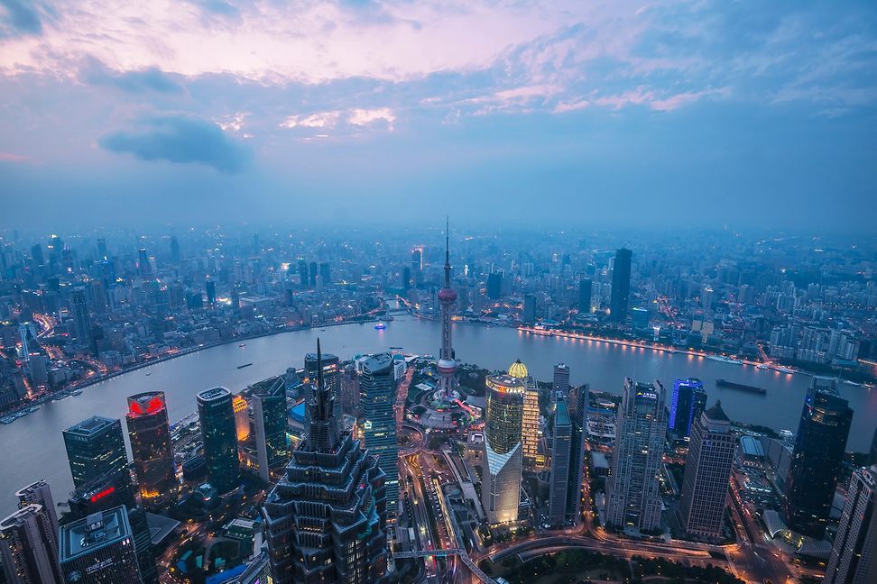 Bird's eye view of Shanghai and the Huangpu River at Blue Hour