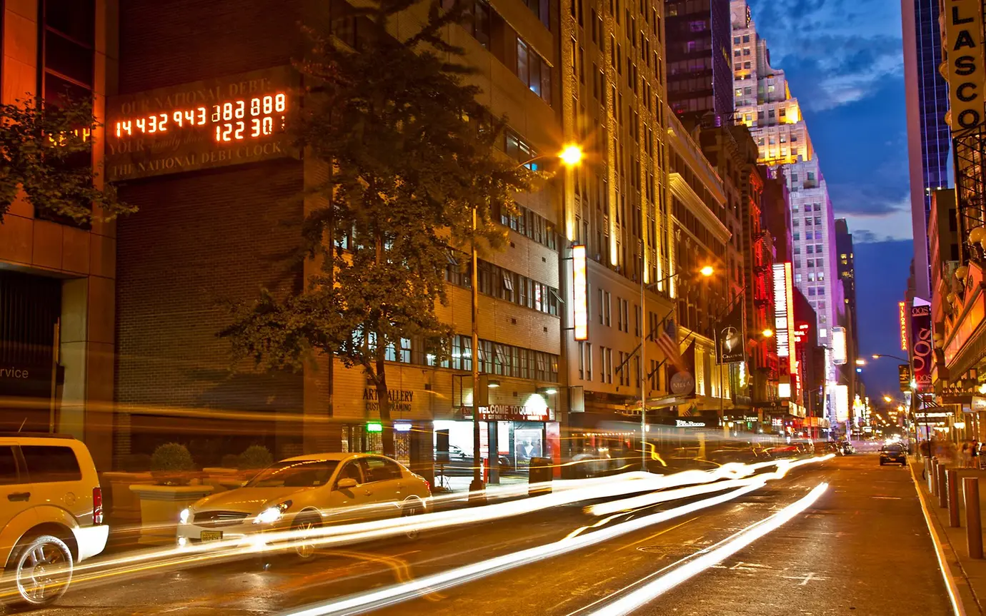 On a busy street in a big city at night, an electronic display shows a series of numbers.