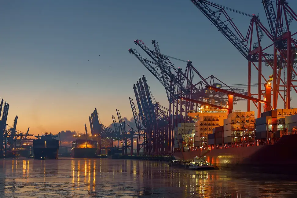 Harbour cranes and loading and unloading facilities light up the night in a major port.