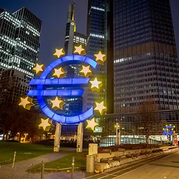 The ECB building in Frankfurt with an illuminated euro sculpture in the foreground.