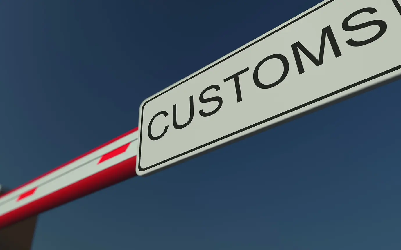 Gate with the inscription "Customs," viewed from below against a blue sky.