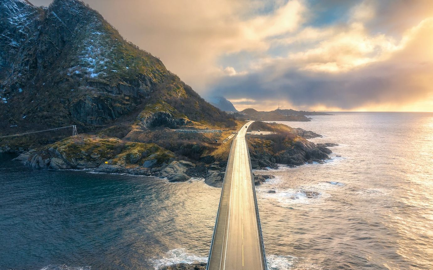 Eine Brücke überspannt das Wasser in einer hügeligen Landschaft am Meer