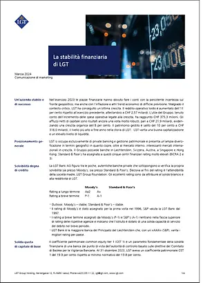 I nostri opuscoli presentano la nostra impresa, i nostri servizi, i nostri prodotti e alcune nostre sedi. Inoltre, nei factsheet affrontiamo interessanti temi di attualità, come la stabilità finanziaria di LGT.