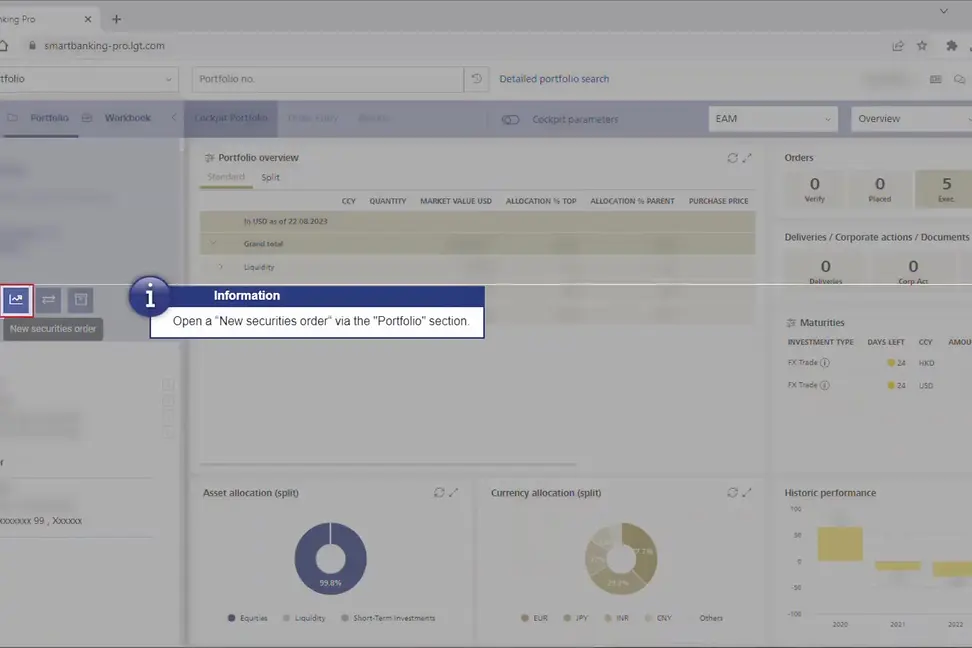 If an asset is not available in the LGT asset database, an asset opening can be requested. You can inquire an asset opening directly in LGT SmartBanking Pro using the "New securities order" function.