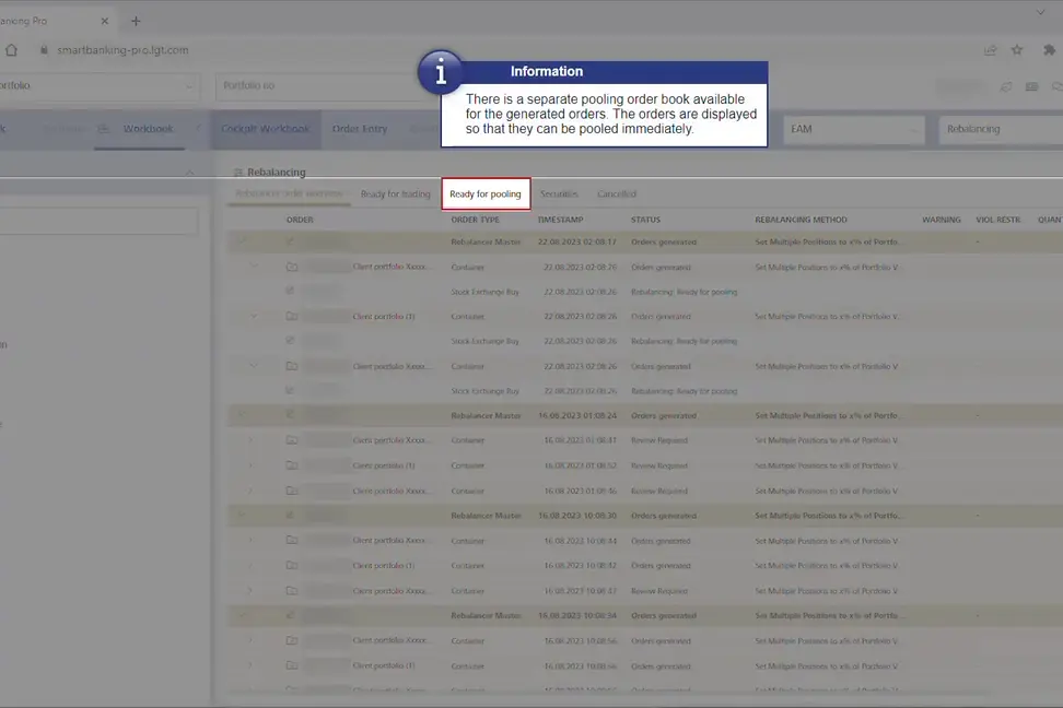 If an order of an individual portfolio requires a review resulting from the validation process, the order can be reviewed through the "Edit" action in the order book. Then please click on the "Proceed to Ready for Pooling" button on the order. The corresponding validation will be displayed in a pop-up message.